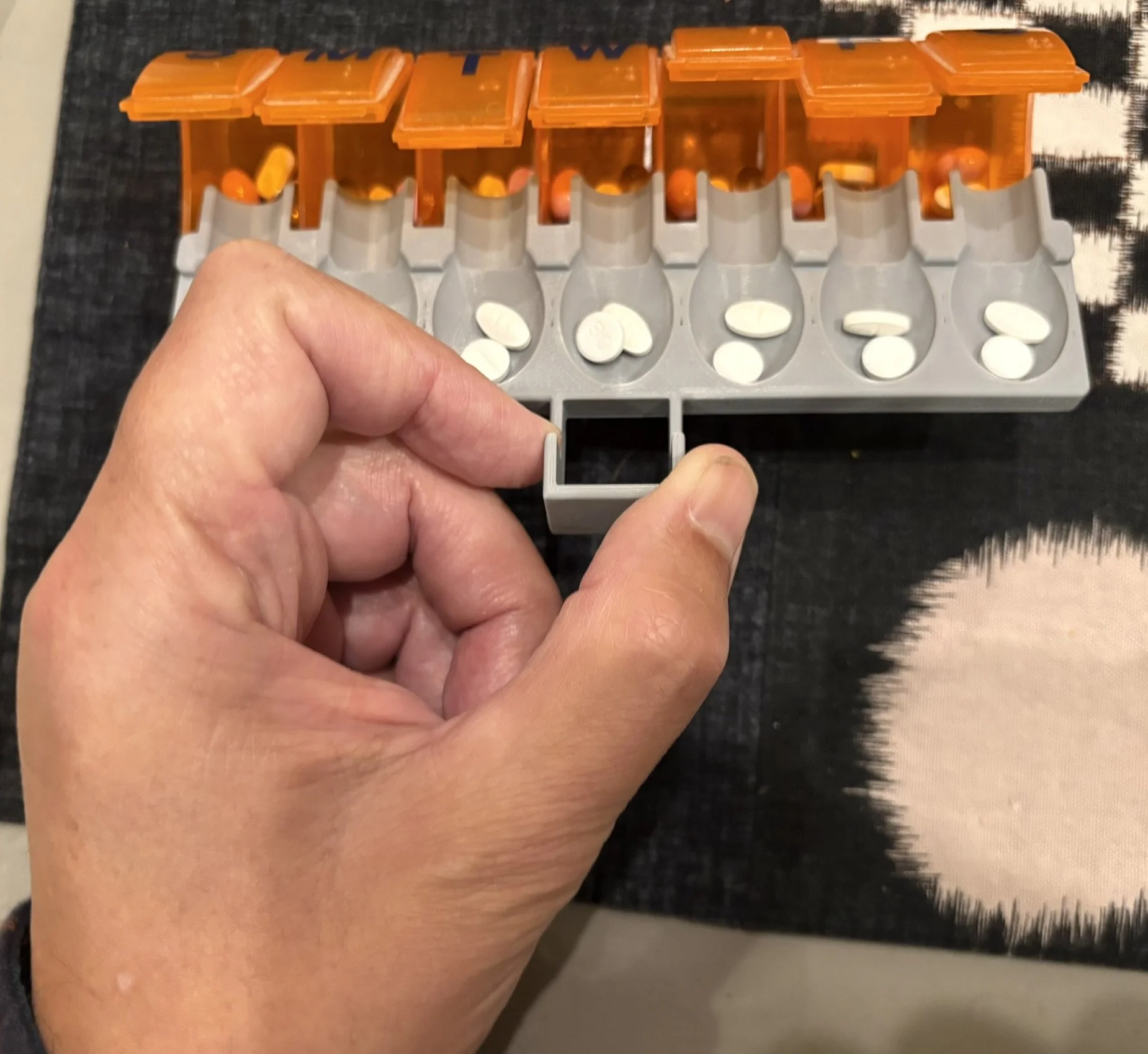 Do you have trouble reliably getting little pills into the little compartments on your weekly pill organizer? I designed a little device to help with fumbling fingers like mine. Just place the pills into the seven divots, then pour them into the organizer. If a pill goes in the wrong divot, then it’s much easier to grab and move it between divots than between tiny compartments.
